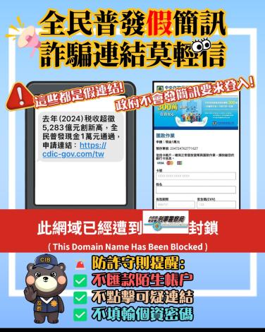 近期發現詐騙集團以普發現金一萬元為題,發送釣魚簡訊予民眾,誘騙民眾點擊連結至假冒中央存保公司網站輸入信用卡號、銀行帳戶及個人資料等敏感資訊以進行金融詐騙,危害民眾財產安全,為防制詐騙威脅擴大,加強宣導刑事警察局防制普發一萬元詐騙相關素材。